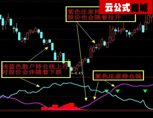 2,紫色线为庄家持仓线,代表庄家持仓情况;向上则说明庄家增仓已经拿到了廉价的筹码,股价也会随着向上拉升,向下说明庄家减仓出跳!股价也会有相应的调整