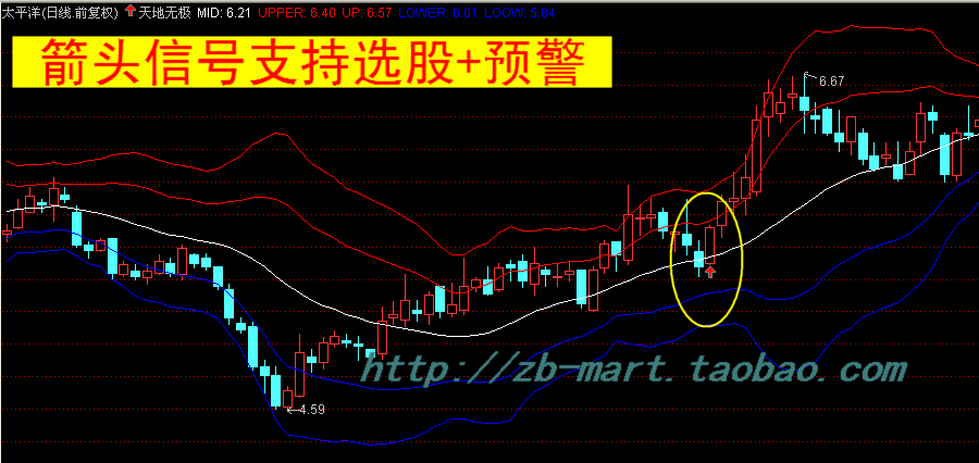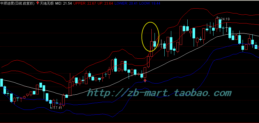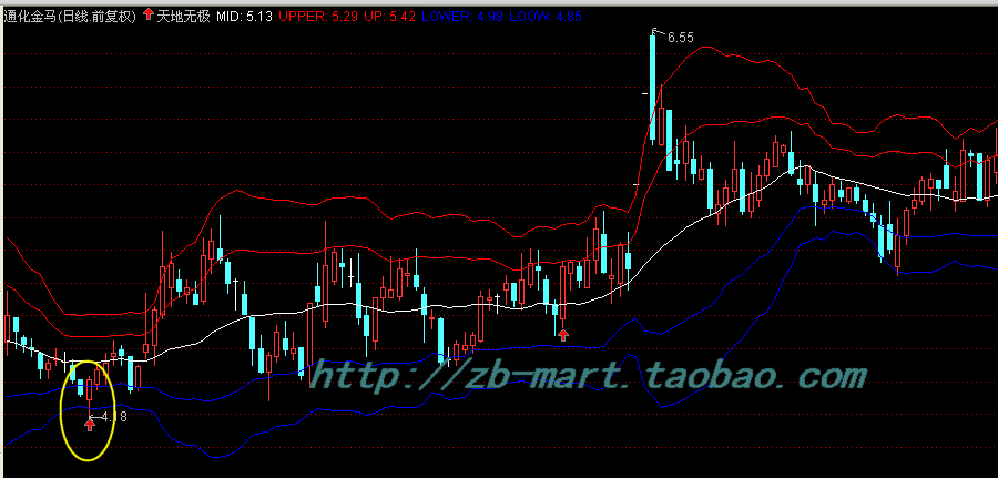 天地无极上轨的实战应用:上轨具有较强的压力,当股价运行到上轨位置,特别是收出带较长上影线的K线时,很有可能会短线下跌,掌握了上轨的应用方法,非常有助您卖出一个相对高价!