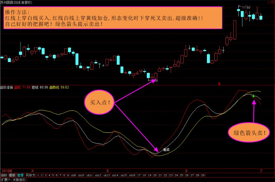 通达信 超级准确指标红线上穿白线买入,红线白线上穿黄线加仓。