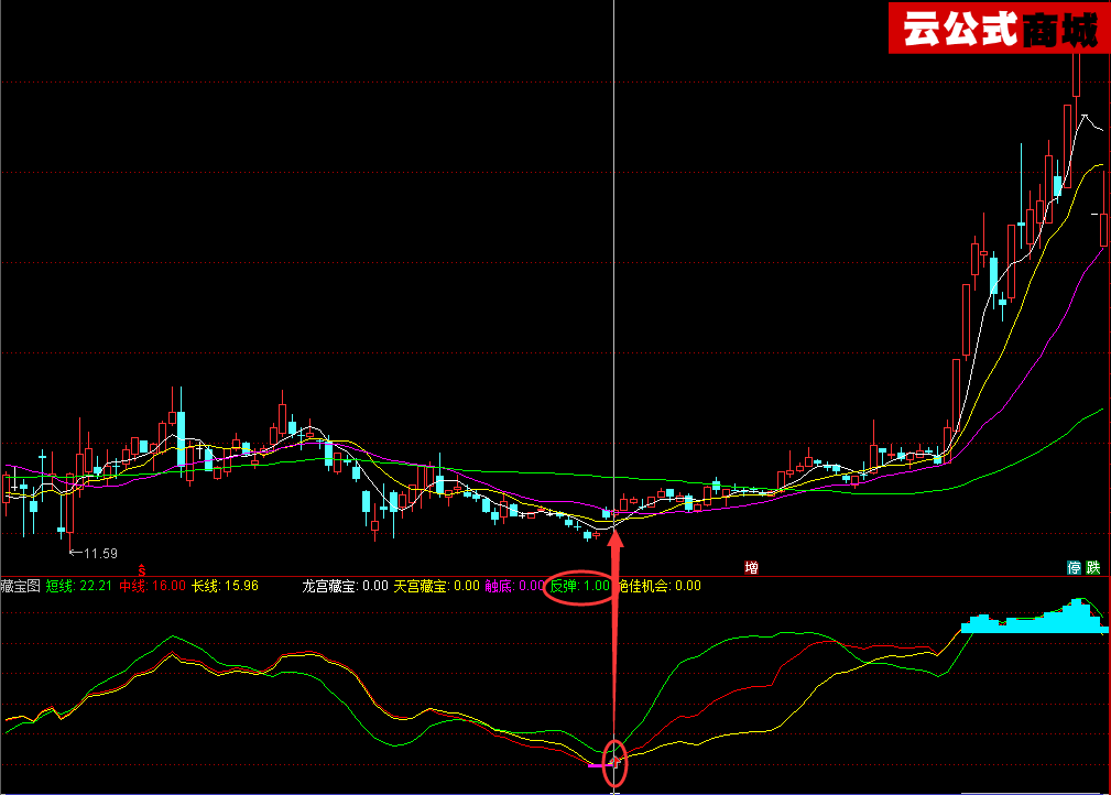 1.龙宫藏宝(即黄色柱体)和触底(标注“底”字),表示股价处于底部区域;
