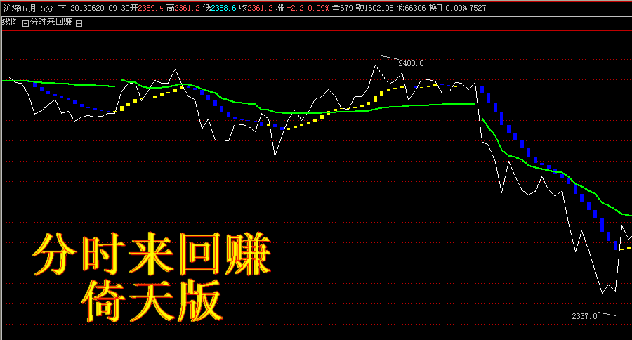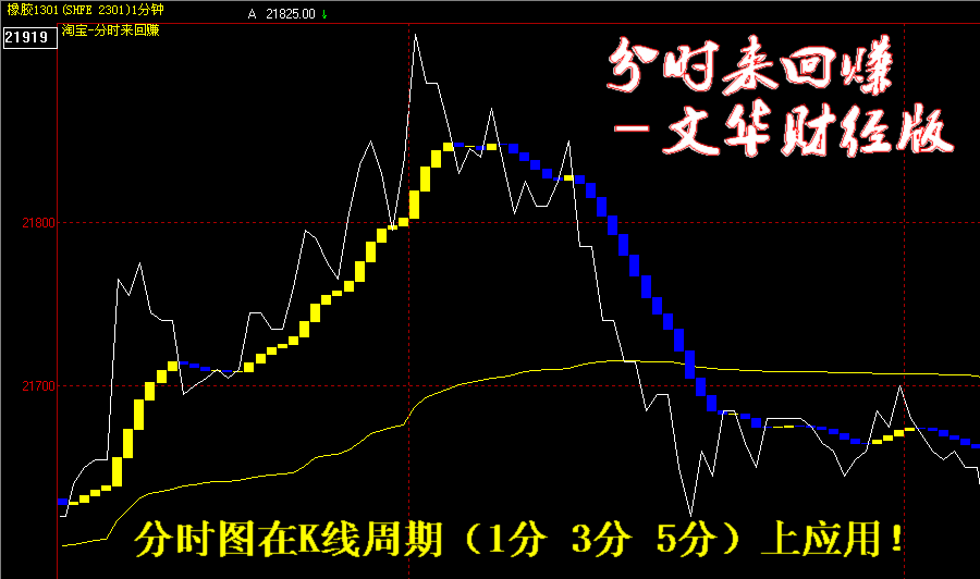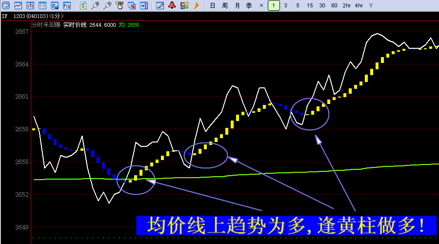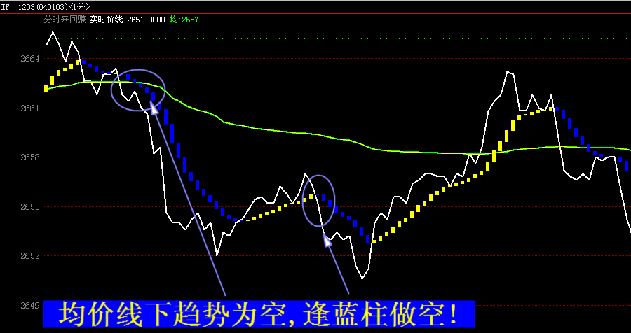 分时来回赚操作要点: 均价线是超级短线实战的一个重要研判工具。均价线上趋势为多,逢黄柱做多;均价线下趋势为空,逢蓝柱做空; 提醒您:止损不能忘!!!切记不可重仓孤注一掷!