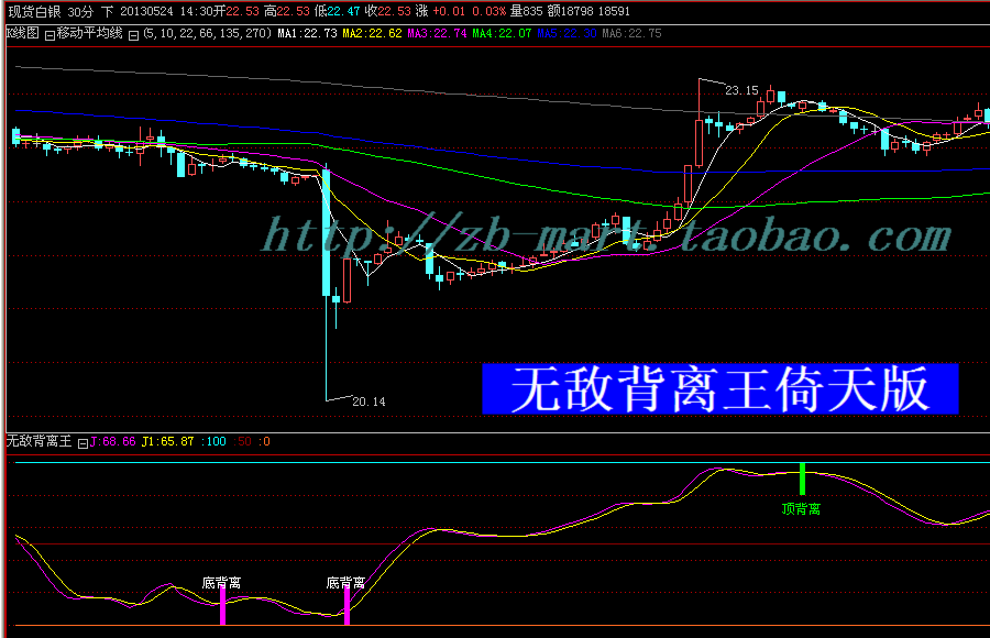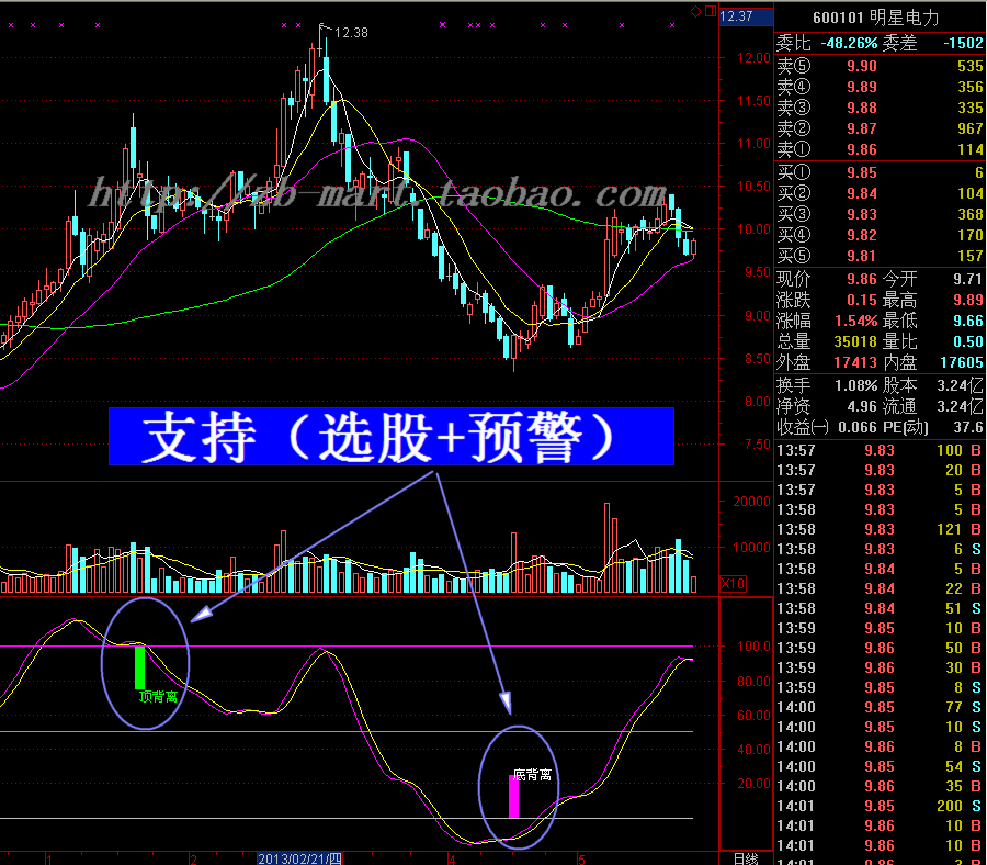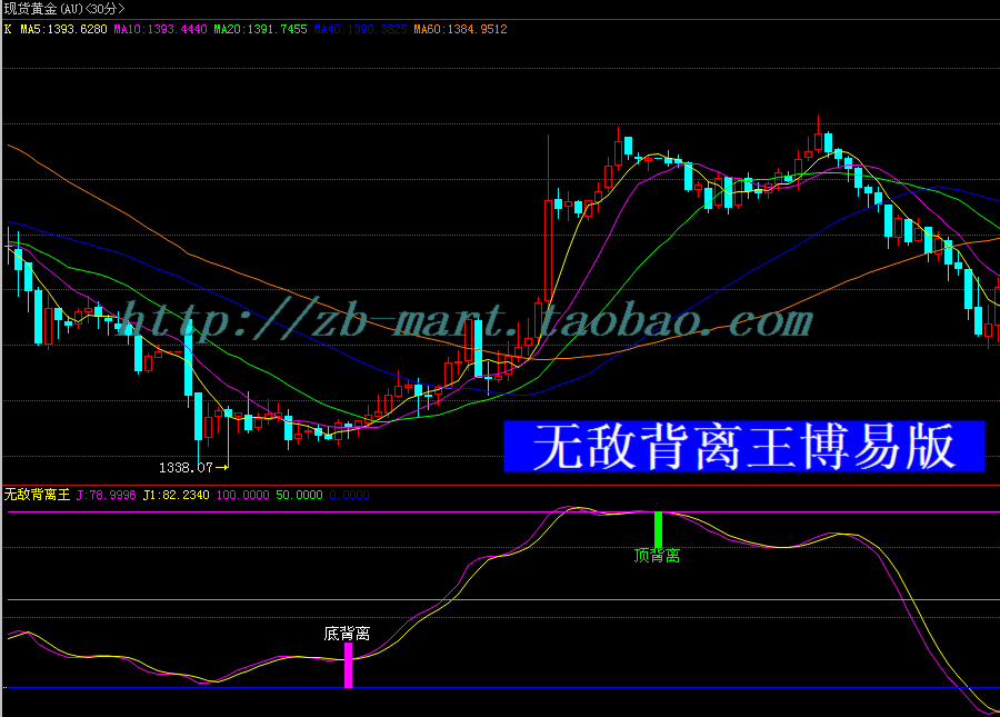 指标背离有两种,一种是顶背离,另一种是底背离。顶背离通常出现在股价的高档位置。当股价的高点比前一次的高点高,而指标的高点却比指标前一次的高点低,换句话说,就是当指标处于高位,并形成一峰比一峰低的两个峰,而此时股价却对应的是一峰比一峰高,则表示该指标怀疑股价的上涨是外强中干,暗示股价很快就会反转下跌,这就是所谓的“顶背离”,是比较强烈的卖出信号。反之,底背离一般出现在股价的低档位置,当股价的低点比前一次的低点低,而指标的低点却比指标前一次的低点高,也就是说当指标认为股价不会在持续地下跌,暗示股价会反转上涨,这就是“底背离”,是可以开始建仓的信号。