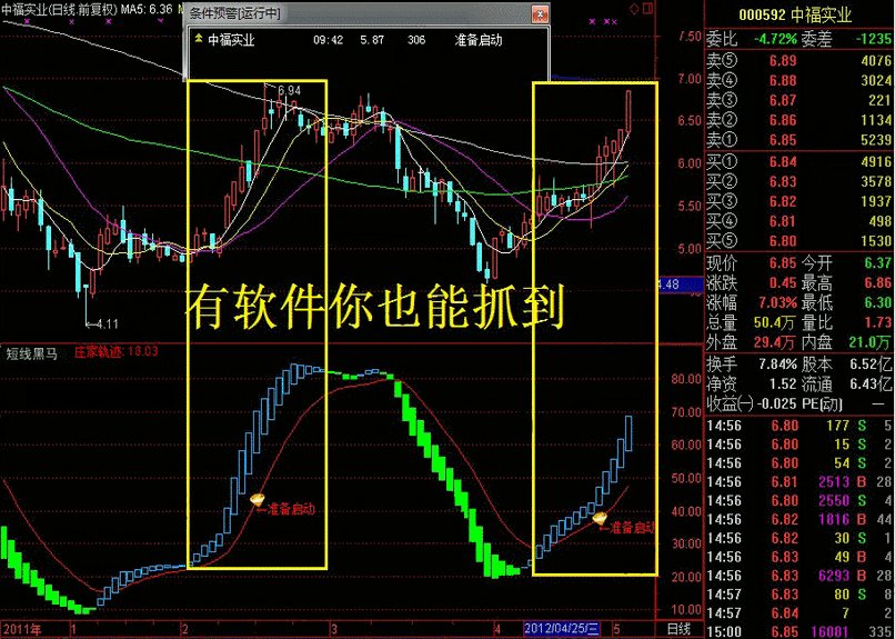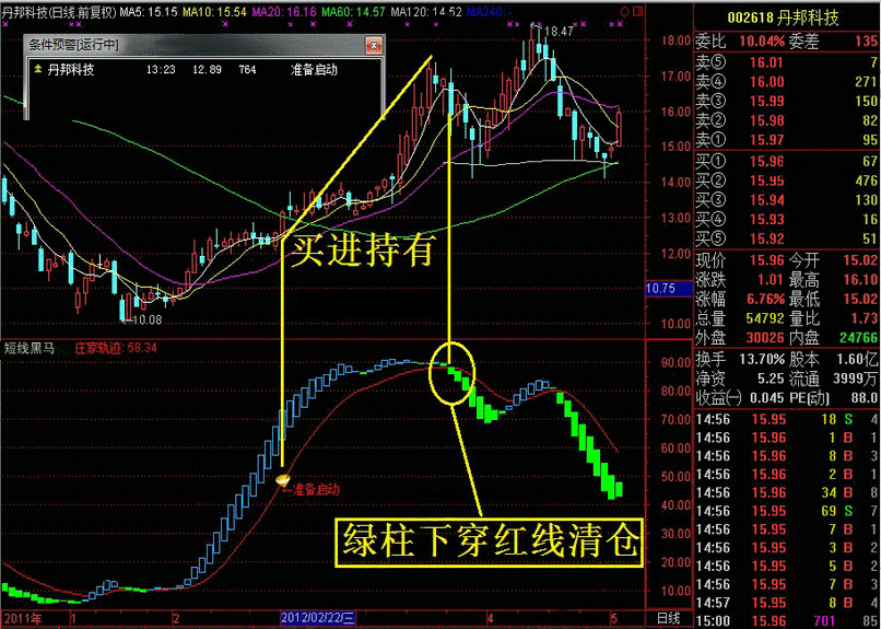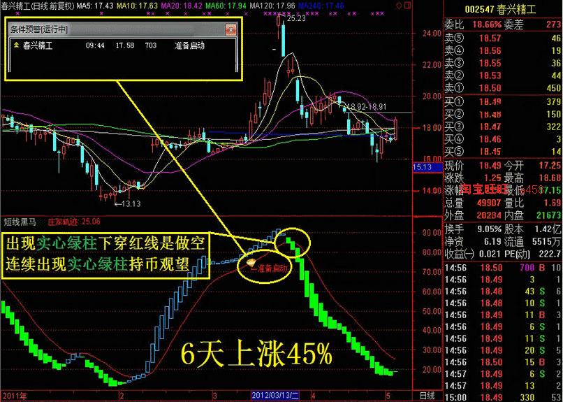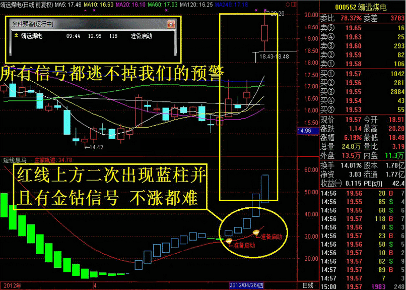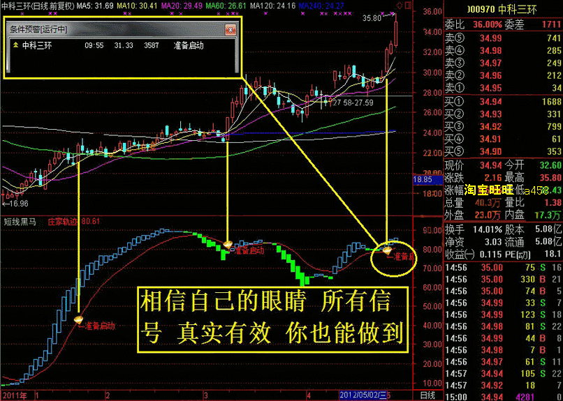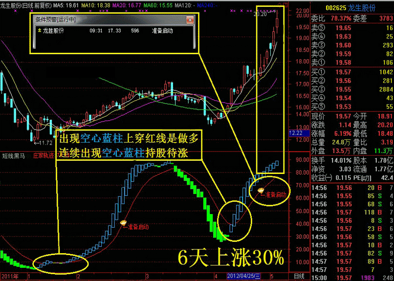 操作提示2:利用金钻黑马短线炒股预警系统可以做波段 一年只做一只票 ,出现蓝柱的的一天买进50%的仓位,第二天继续出蓝柱再买进50% 的仓位。卖出也是同样,的一天出绿柱卖出50%的仓位,第二天继续是绿柱再卖出50的仓位。出绿柱就休息 坚决不换票 ,一年中也能碰到大涨的那天 ,一年50%个点应该很轻松获得,做股票 就这么简单,你还在考虑吗?