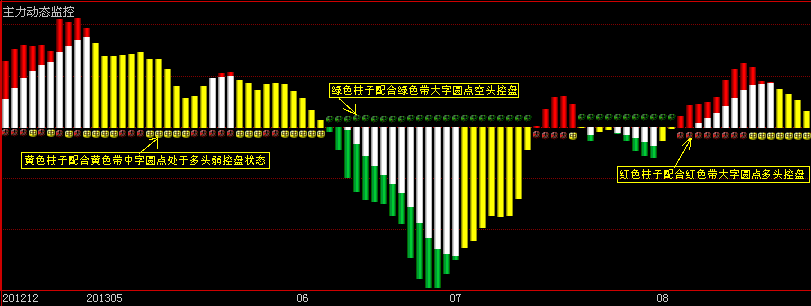 【黄色柱子配合黄色带中字圆点】黄色柱子配合黄色带中字圆点,处于多头弱控盘状态,行情以横盘为主。