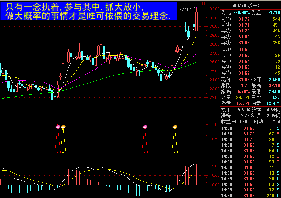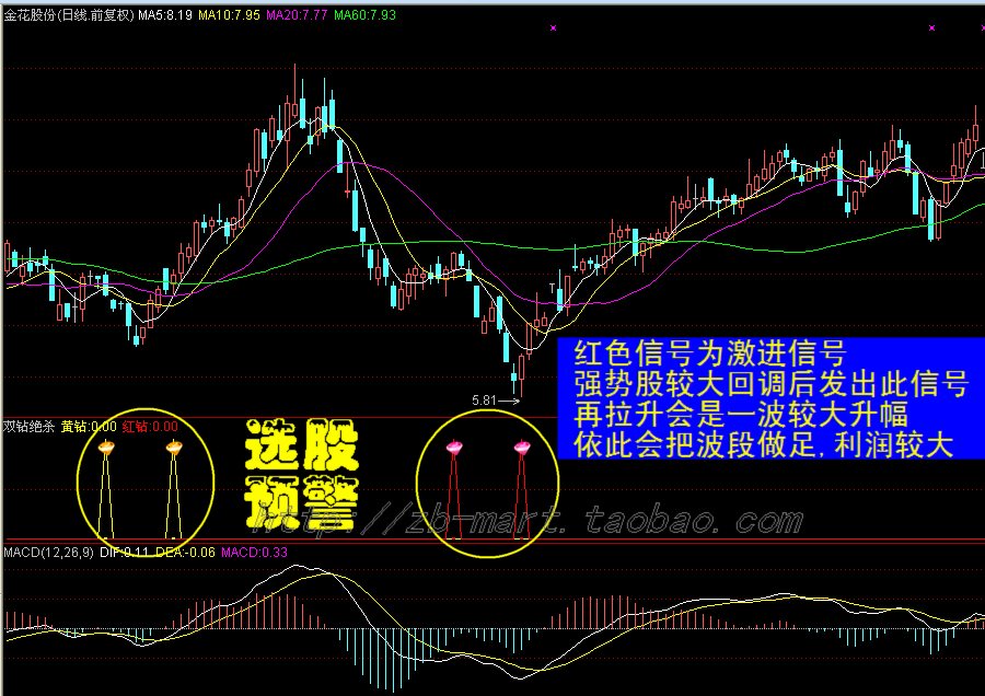 红色信号为激进信号 强势股较大回调后发出此信号再拉升会是一波较大升幅 依此会把波段做足,利润较大缺点是弱抛中成功率较低 .关于弱势请见上面的四点注意事项.