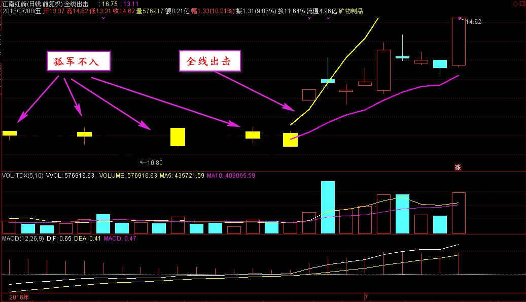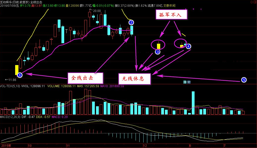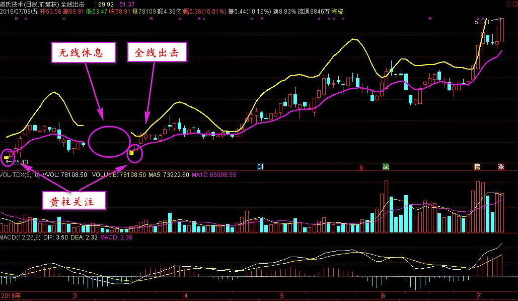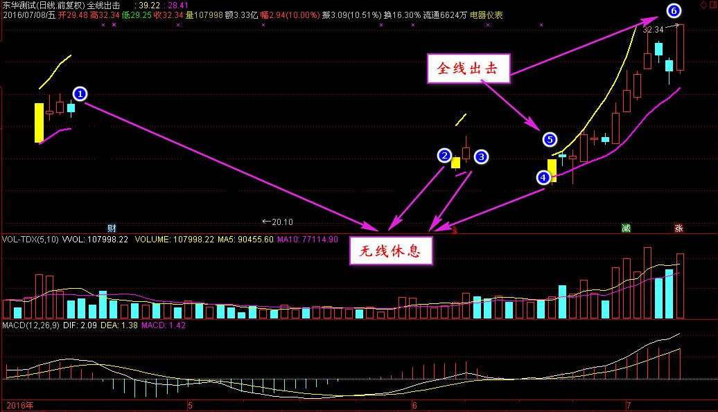 通达信全线出击主图指标用法全线出击,无线休息,黄柱关注,孤军不入。