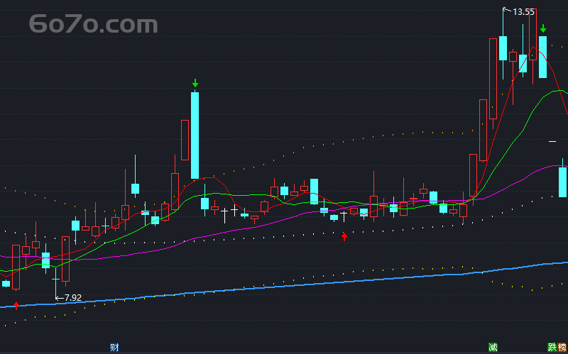 - 当股价触及下轨(LOWER)时,出现买入信号(绿色箭头)。