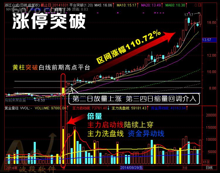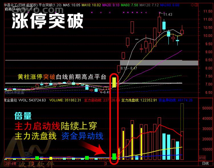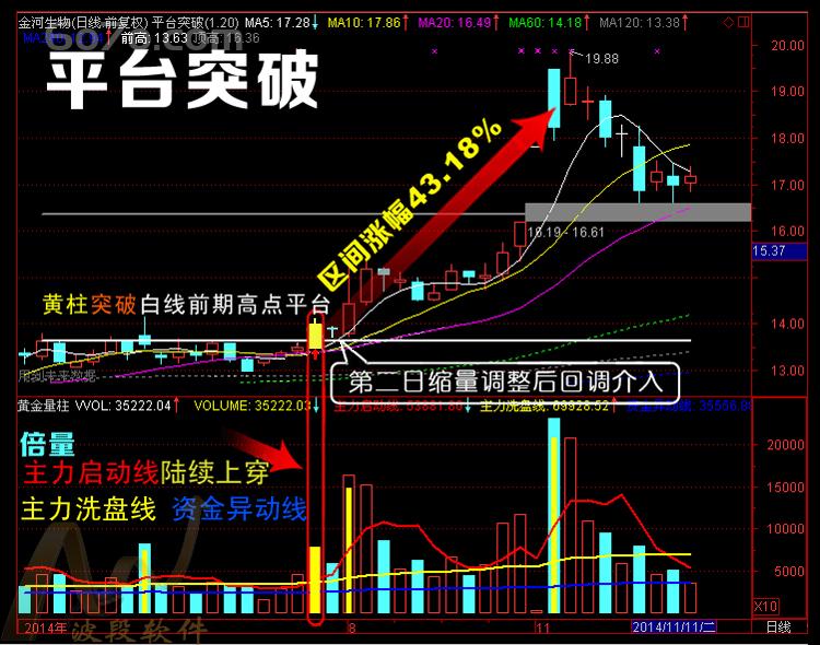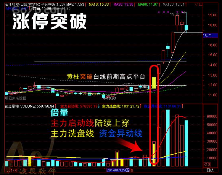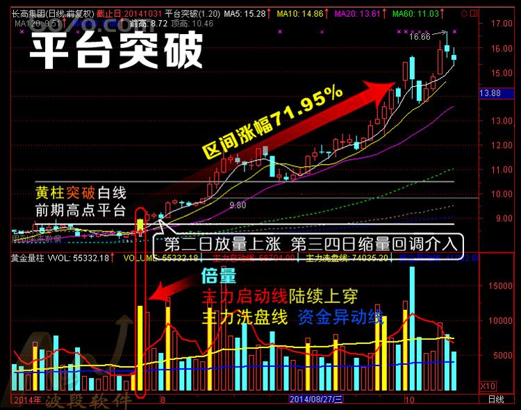 平台洗盘结束的最基本标志就是:一根放量的大阳线突破平台整理时的最高点,并且收盘时大阳线收盘价收在在平台整理时的最高之上。突破性大阳线所代表的是主力结束洗盘再次做多的标志!
