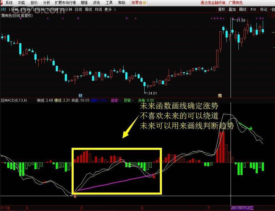 指标用法:MACD出现空心,动能减弱,画线是用未来画的,只是用来确立趋势用的,别担心。 指标只是工具,没有万能的指标,只有相对稳定的指标。