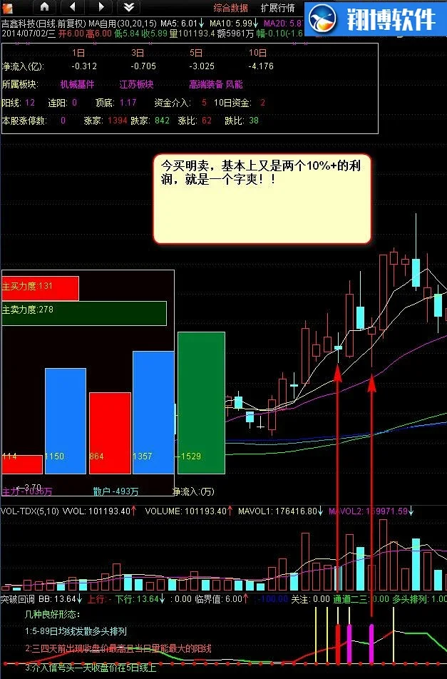 4、牛熊通吃,不用过多考虑大盘因素,不用过多考虑业绩因素,只要指标提示,再加上精选优良形态的方法(购买后有详细说明),基本可达到:只要出手,就有2%-5%的盈利!!