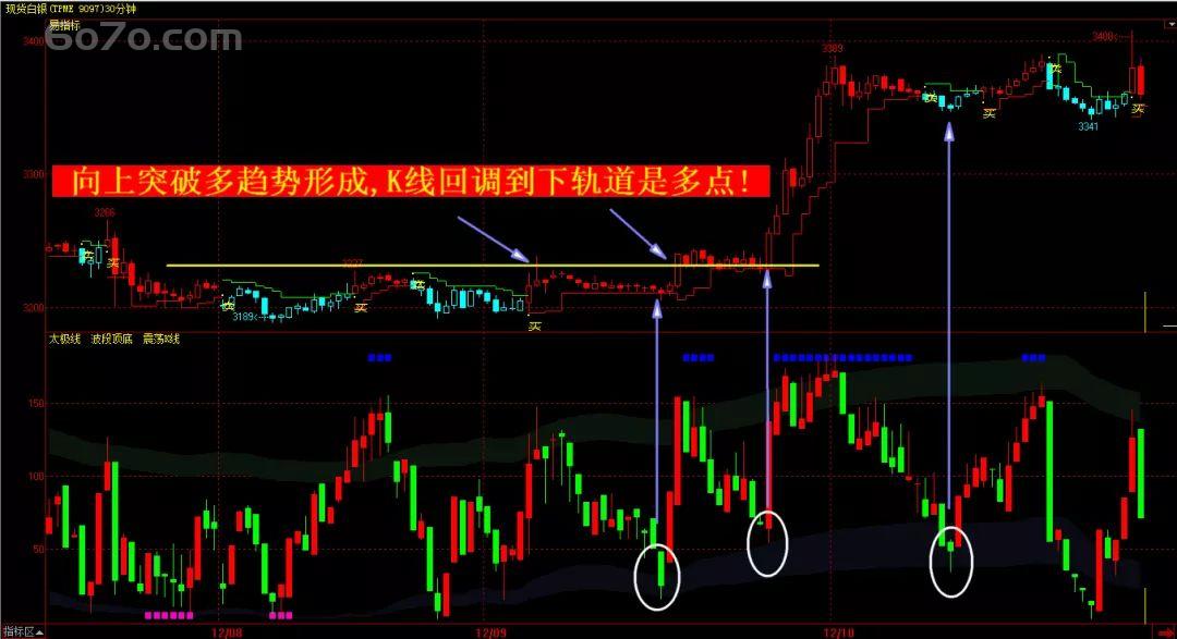 1,向上突破多趋势形成,K线回调到下轨道是多点!