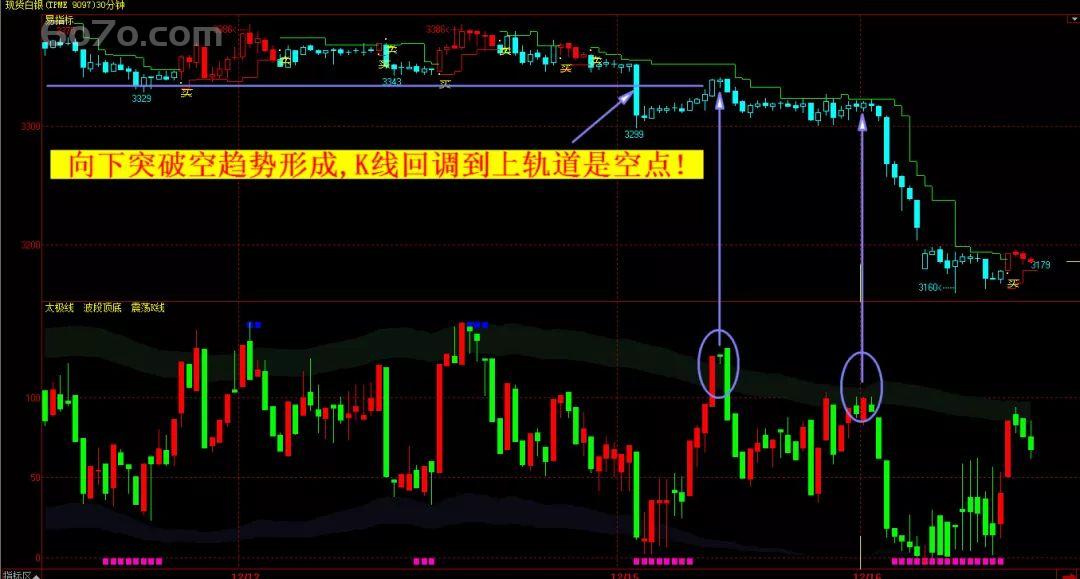 2,向下突破空趋势形成,K线回调到上轨道是空点!