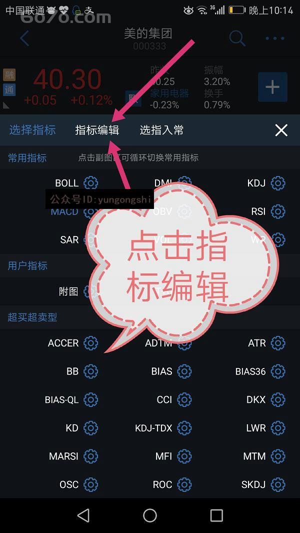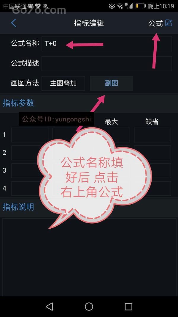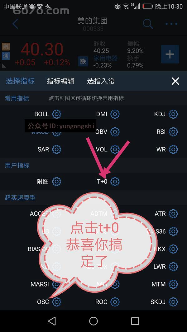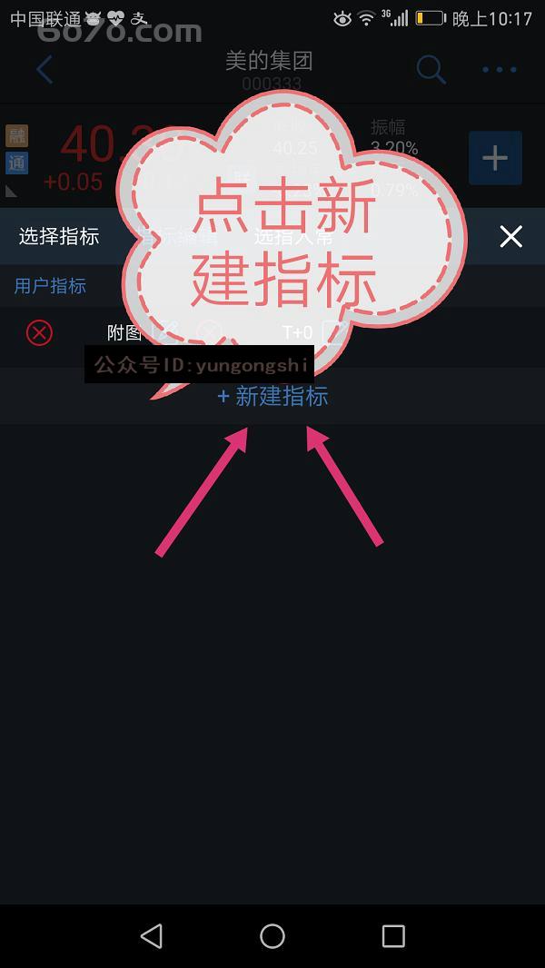 【第三步】点指标编辑之后,下一步点“新建指标”如下图: 【第四步】进入新建指标页面,先填写要新建指标的名称,写T+0即可,然后画图方法选“副图”最后点右上角“公式” 如下图: 【第五步】这个地方要注意了,在空白地方快速双击手机屏幕,淡蓝色光标上会出现“粘贴”粘贴您之前复制的,然后点保存,如下图: 【第六步】上面的保存成功了下面就教您将指标放到分时副图上,点击手机分时副图上显示的指标,如下图 正在使用的是MACD 点击进入到选择指标页面 最后一步点击上面您亲手创建的T+0,就搞定了 指标不是万能的,但是没有指标却是万万不能的. 目前中国股市的现状,已经不再是那个凭个人的那点小脑筋能驾驭的时代了,为什么有人炒票亏钱!这是个人操作问题!不知何时买卖! 要点:结合指标,盯紧一只股票,不要贪心,每天盘中 3%以下做差价,积小成多,祝您发财,. [公式讲解]: A股T+1,而公式怎么叫T+0。比如昨天买了1000股,今天冲高卖出1000股,再低位买回1000股;或是先买入,待冲高再卖出;来回滚动操作,降低成本!这就是T+0的方法与用途。 **************************************************************************** 【做T+0的建议】 【用法】说明