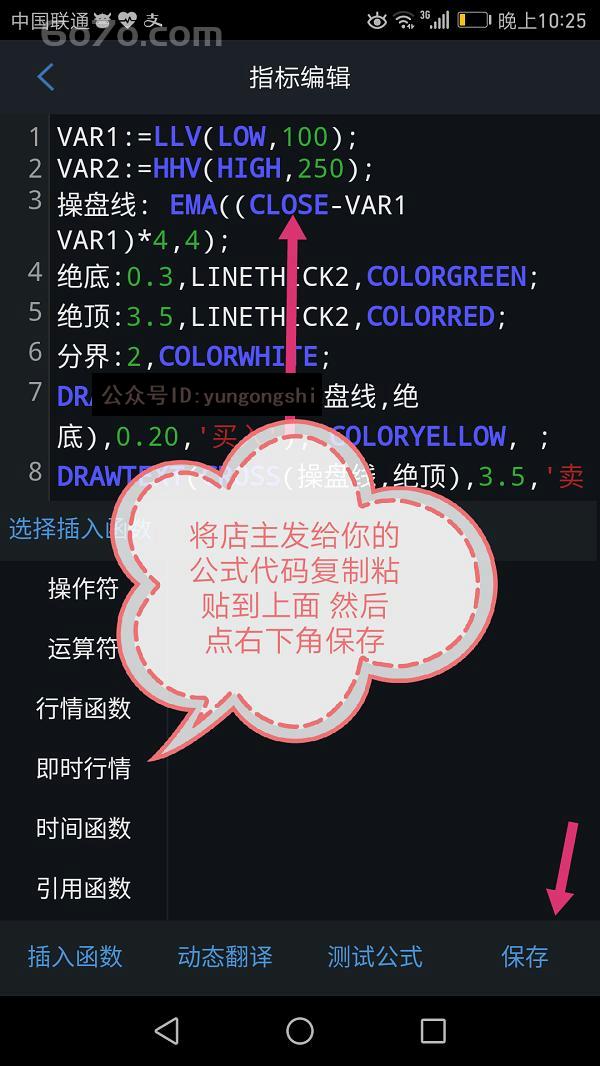 【第一步】先下载发给您的两个文档,然后用手机复制指标代码,如果您是电脑下载的,复制后用电脑上的QQ发送到您的手机QQ,手机QQ接收后复制,如果您是手机下载的,直接打开复制,然后按下面图示操作:
