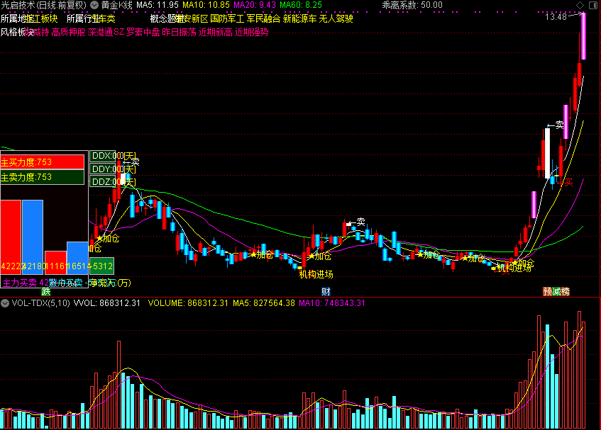 兄弟们,炒股嘛,最核心的就是看懂K线图。要是能精准分析出市场的买卖信号,那赚钱的机会可就多了!黄金K线主图就是这么一个“解盘神器”,它不仅能帮你快速识别市场趋势,还能让你轻松把握买卖时机。有了它,你就能在股市里更从容地应对各种情况。