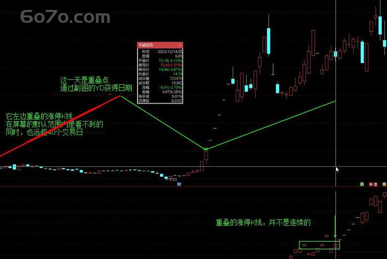 如果按照常规思路,想要找到这些不连续、时间跨度大的涨停K线重叠股票,算法会非常复杂。就算是在主图里把涨停的K线显示为彩色K线,如果时间跨度较大,也会看得眼花缭乱。