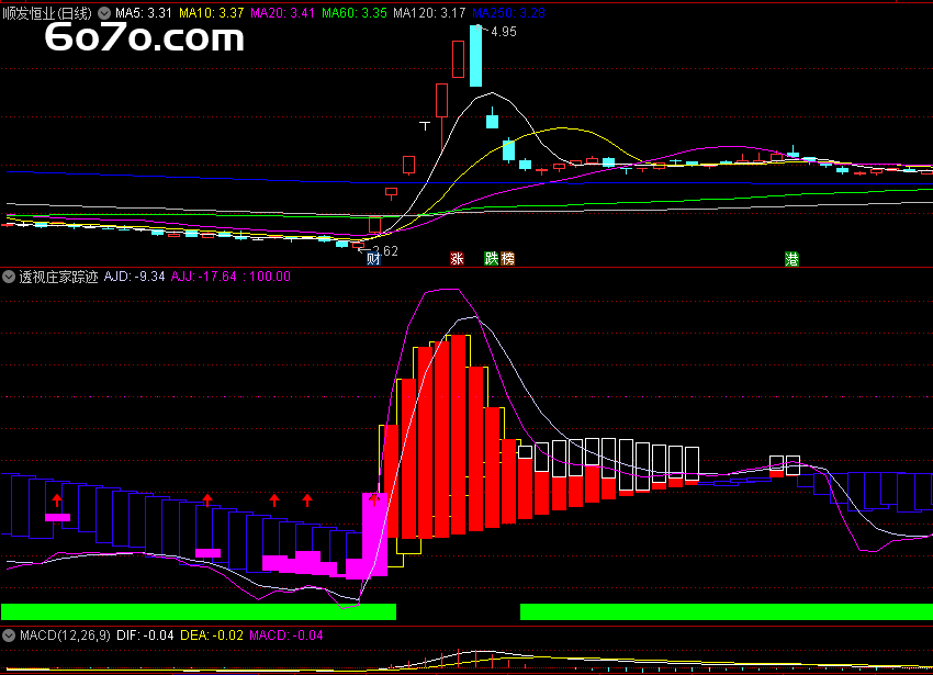 这个指标最大的亮点,就是能帮咱们判断顶底进出。先来说说那些绿色横条,它们可是筑底的重要信号!一旦绿色横条出现,就好像在告诉你:“嘿,底部快到啦,准备好抄底的资金吧!”这时候,大胆布局,说不定就能抓住股价起飞前的绝佳时机。
