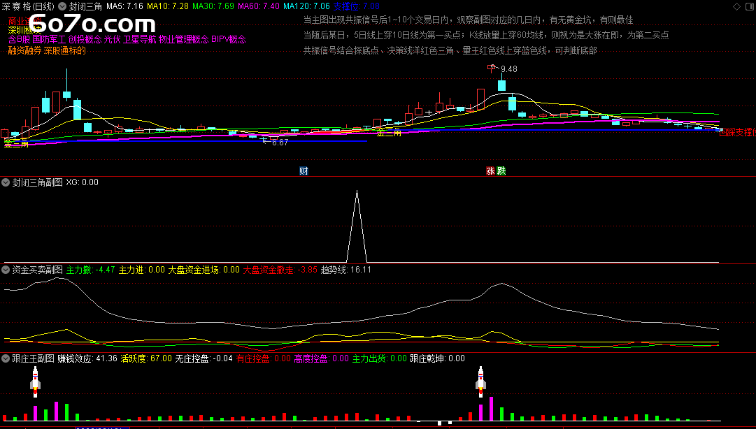 封闭三角副图:它通过独特的算法,将股价的走势以一种直观的方式呈现出来。当封闭三角的形态出现时,往往意味着股价即将迎来变盘。如果是向上的封闭三角,那大概率是股价要上涨了;如果是向下的封闭三角,那可得小心了,股价可能要下跌。