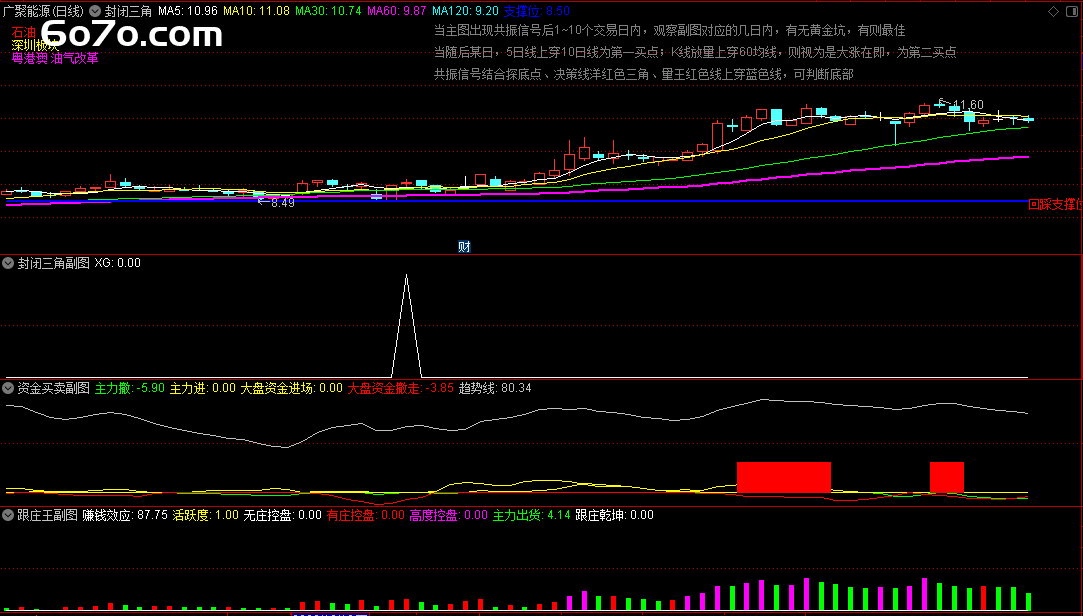 这个 封闭三角 指标可不简单,它内含一主三副,分别是主图指标和资金买卖、封闭三角等副图指标 ,而且最关键的是,资金买卖和封闭三角副图无未来函数,这意味着信号稳定,不会出现今天一个样明天又变了的情况,让你操作起来心里更有底。
