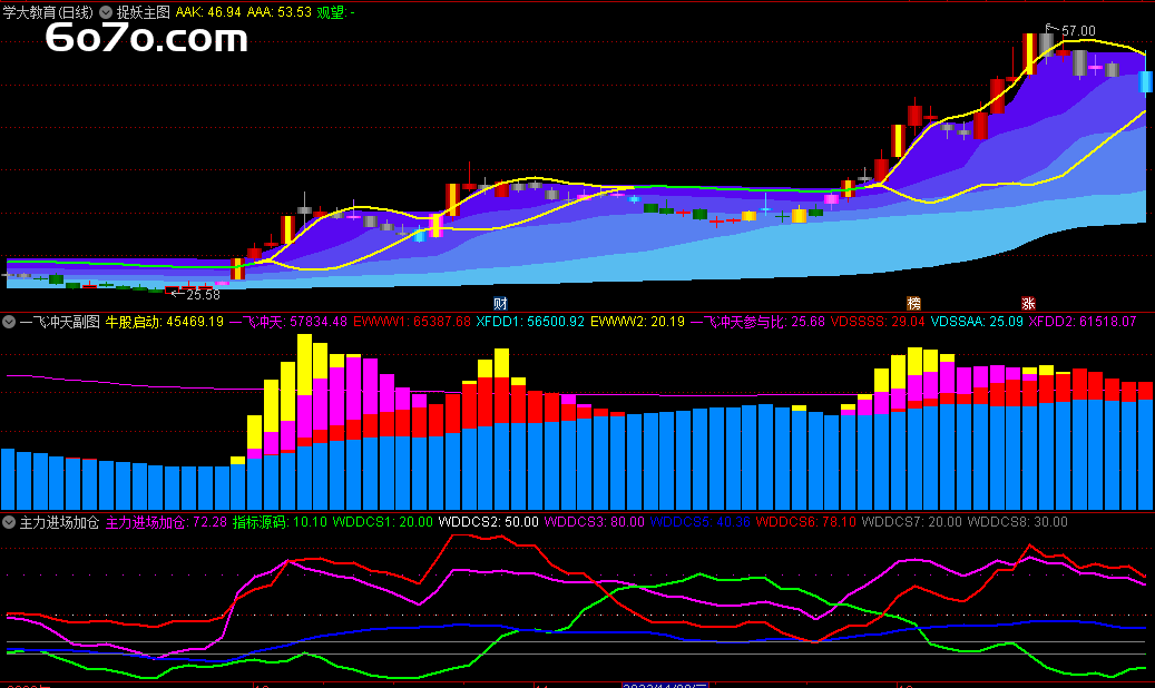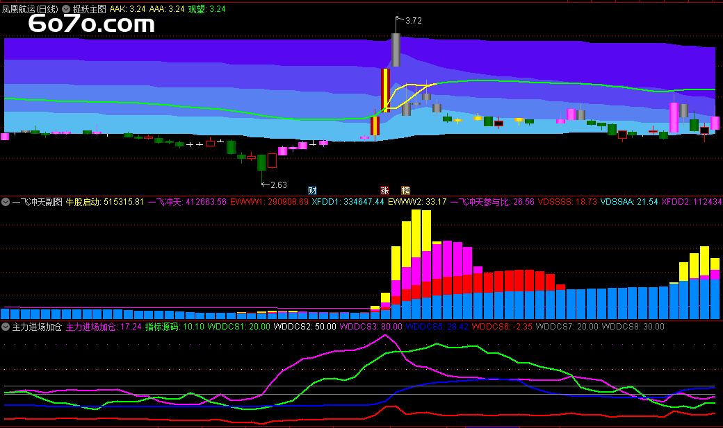 副图二:一旦出现黄粉红彩色带,恭喜你,很可能已经锁定了一只潜力妖股,这个时候就可以考虑介入了。当然啦,大家也可以结合自己平时用的指标,进一步优化操作策略 。