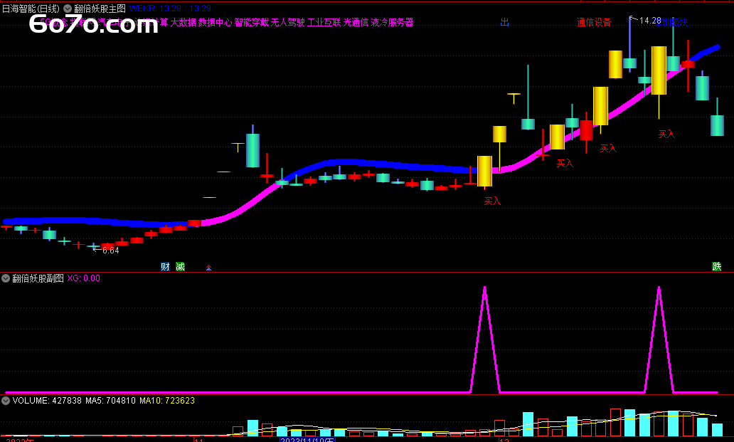 然后用 K、D、J 指标(KDJ 指标)来判断股票的超买超卖情况,当 J 上穿 0 且 MACD 大于 DEA 时,说明股票可能处于上涨初期,此时会在副图上标注黄色的 “★” 信号。