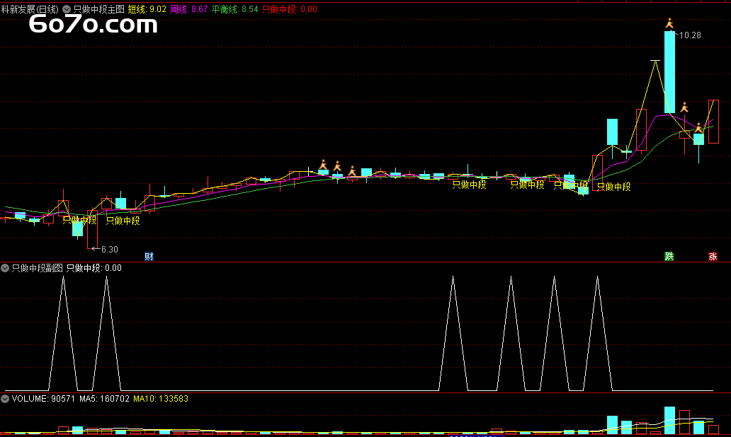 主图指标主要是通过计算 5 日、10 日和 20 日的移动平均线,当这三条均线形成黄金交叉(即短期均线向上穿过长期均线)时,就会出现 “只做中段” 的信号,这意味着股价短期趋势向好,是买入的时机。