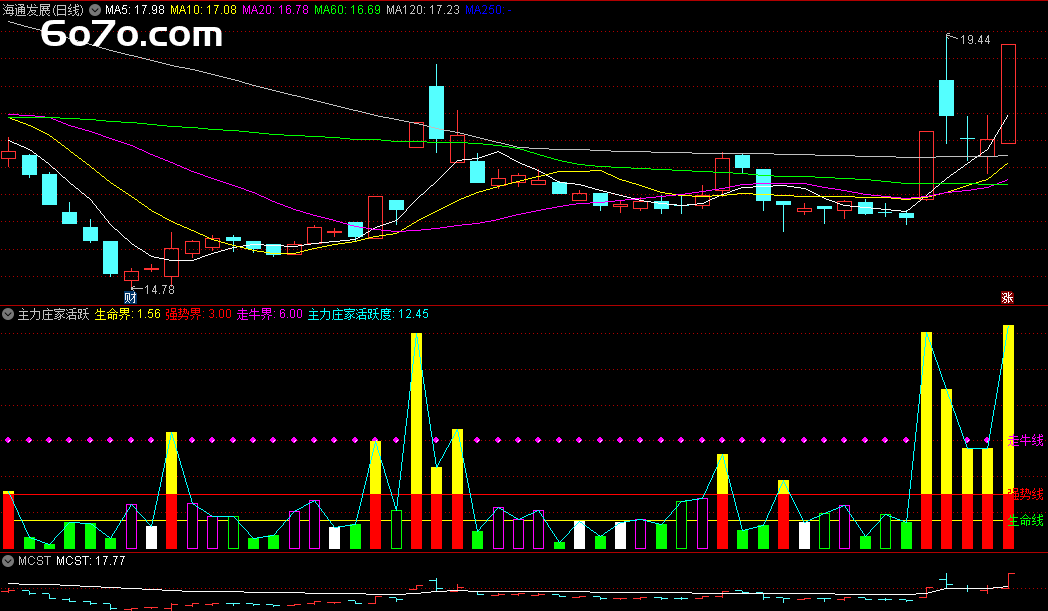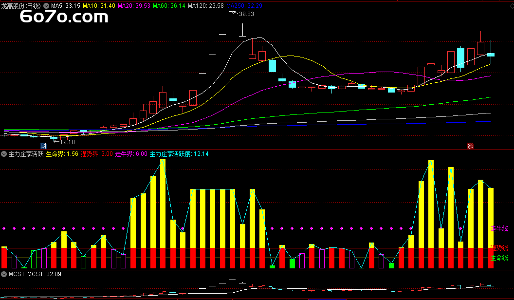 下图是主力庄家活跃度指标公式的典型应用图。从图中我们可以看到,当量柱位于生命界以下时,股票价格呈现下跌趋势;当量柱位于生命界与强势界之间时,股票价格呈现上涨趋势;当量柱位于强势界以上时,股票价格呈现出强劲的上涨势头。