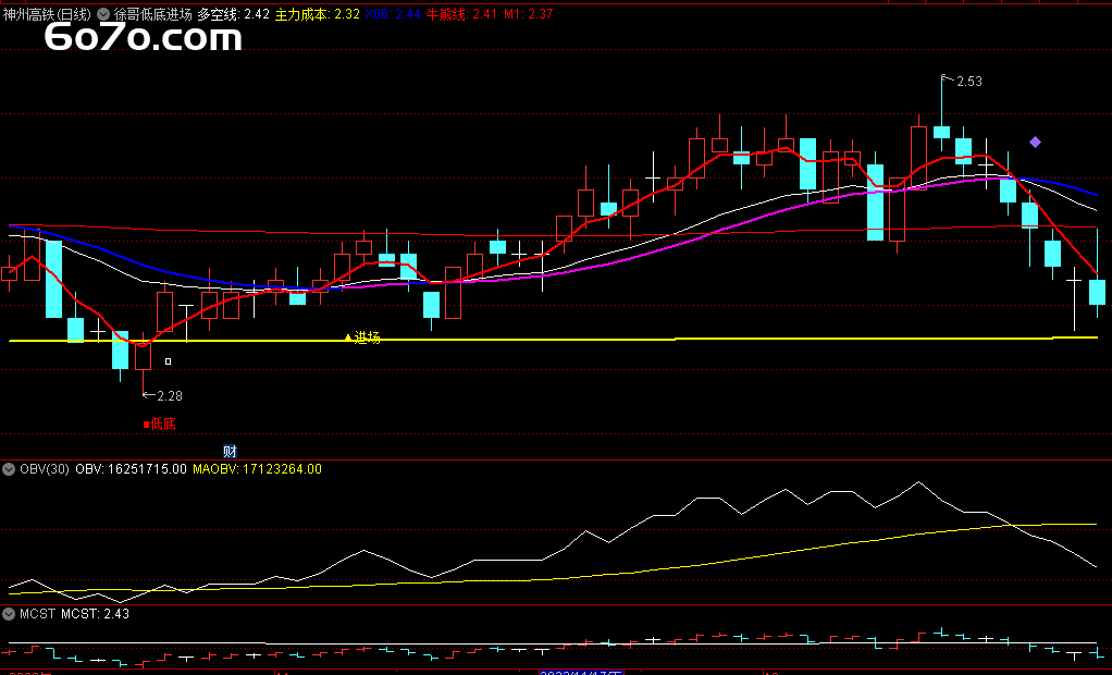 信号提示:股价上穿成本线时显示箭头,低底位置标注文字,简单粗暴!