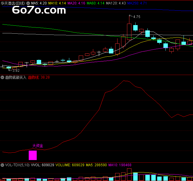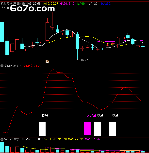 //【趋势底部买入】副图指标VAR1:=SUM(IF(CLOSE>REF(CLOSE,1),VOL,-VOL),0); //OBV改良版主力资金:EMA(VAR1,5)/10000,COLORRED,LINETHICK2;散户筹码:SMA(VOL,20,1)/10000,COLORGREEN;抄底线:LLV(LOW,30)*1.02,COLORLIBLUE;大资金进场:CROSS(主力资金,散户筹码) AND LOW<=抄底线 AND COUNT(CLOSE<OPEN,5)>=3;DRAWTEXT(大资金进场,LOW*0.98,'★大钱来了'),COLORMAGENTA;//【抄底选股】独门条件长下影:= (MIN(OPEN,CLOSE)-LOW)/(HIGH-LOW)>0.7;倍量阳: VOL>REF(VOL,1)*1.8 AND CLOSE>OPEN*1.03;抄底信号: 长下影 AND 倍量阳 AND 大资金进场;