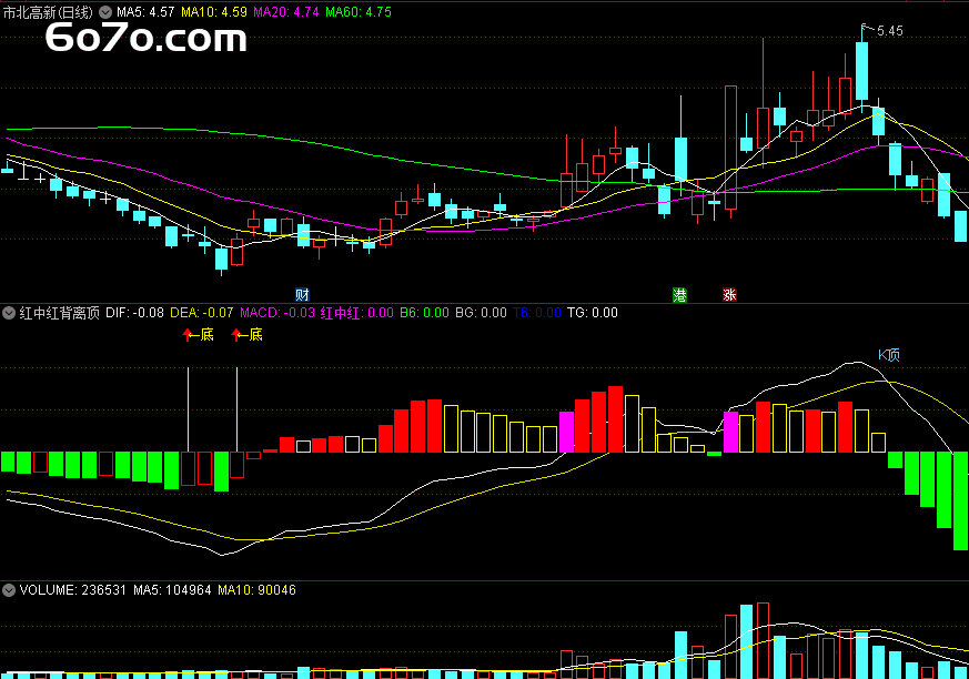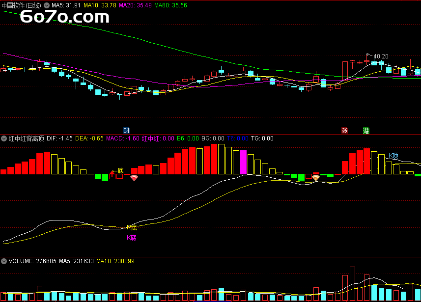{红中红背离顶底-海边的鲨优化版}N:=26; M:=12; P:=9;DIF:EMA(CLOSE,M) - EMA(CLOSE,N);DEA:EMA(DIF,P);MACD:(DIF-DEA)*2,COLORSTICK;//======= 顶底背离检测 ========底背离条件:=LLV(LOW,30)=LOW AND DIF>REF(DIF,1) AND MACD>REF(MACD,1);顶背离条件:=HHV(HIGH,30)=HIGH AND DIF<REF(DIF,1) AND MACD<REF(MACD,1);//======= 量价共振过滤 ========成交量异动:=VOL>MA(VOL,20)*1.5 AND CLOSE>OPEN;均线支撑:=C>MA(C,60) AND EVERY(MA(C,5)>MA(C,10),3);//======= 最终信号 ========钻石底部:IF(底背离条件 AND 成交量异动 AND 均线支撑, LOW*0.98, DRAWNULL),ICON(1);绿箭逃顶:IF(顶背离条件 AND C<MA(C,20), HIGH*1.02, DRAWNULL),ICON(2);DRAWTEXT(钻石底部, LOW*0.95,'←钻石坑'),COLORFF00FF;DRAWTEXT(绿箭逃顶, HIGH*1.05,'←老乡快跑'),COLORGREEN;