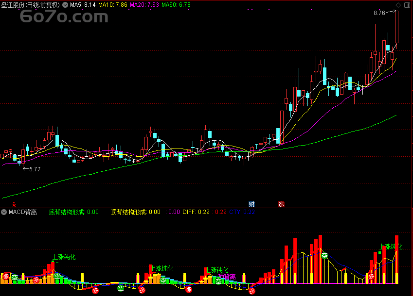 DRAWTEXT(TFILTER(TG,MACD<0,1),DIF*1.02,'顶背离'),COLORMAGENTA;