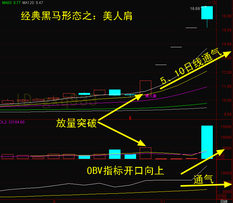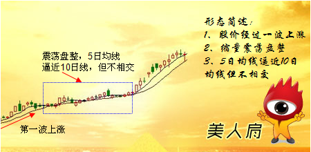 而有相当少部分的股票会出现股价并不下跌,缩量盘整或盘升的状态,这个时候5、10日均价线保持通气,只要能量注入,成交量放大,股价向上突破构成“美人肩”。