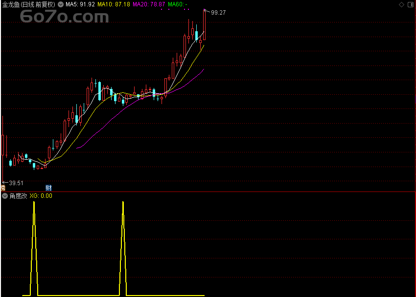 角度MAV5:=ATAN((MAV5/REF(MAV5,1)-1)*100)*180/3.1416,COLORRED;