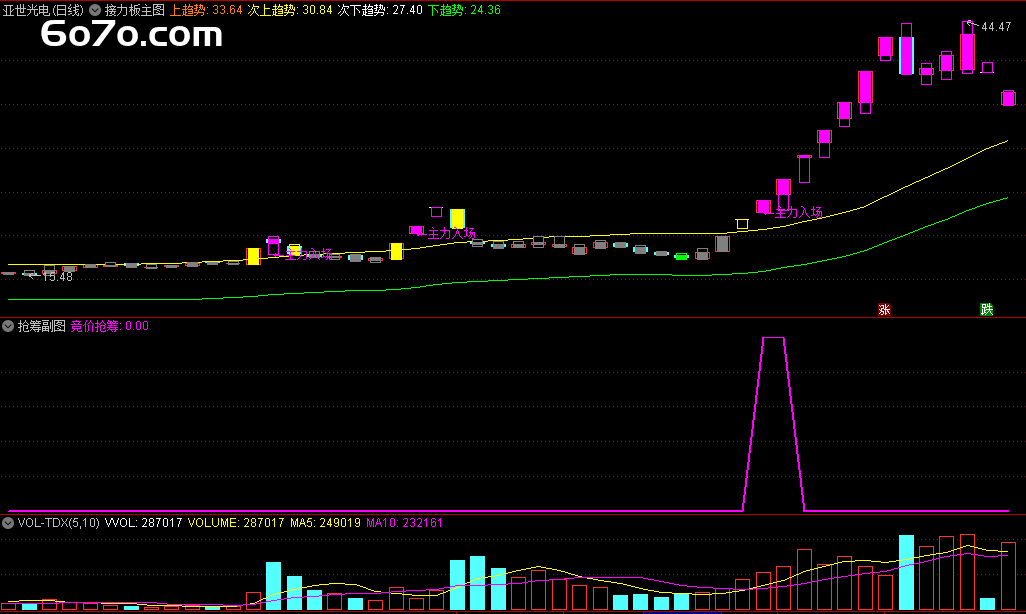 这个发现让我兴奋不已,我决定将这个规律系统化,开发出一套完整的“接力板”指标。经过无数次的测试和优化,我终于完成了这套指标,并在后续的实战中屡试不爽。