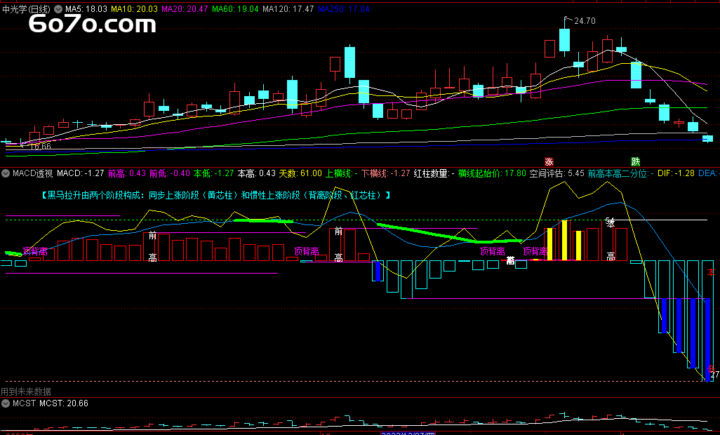 STICKLINE(MACD>REF(MACD,1) AND MACD<0, LOW*0.98, HIGH*1.02, 4, 0), COLORCYAN;