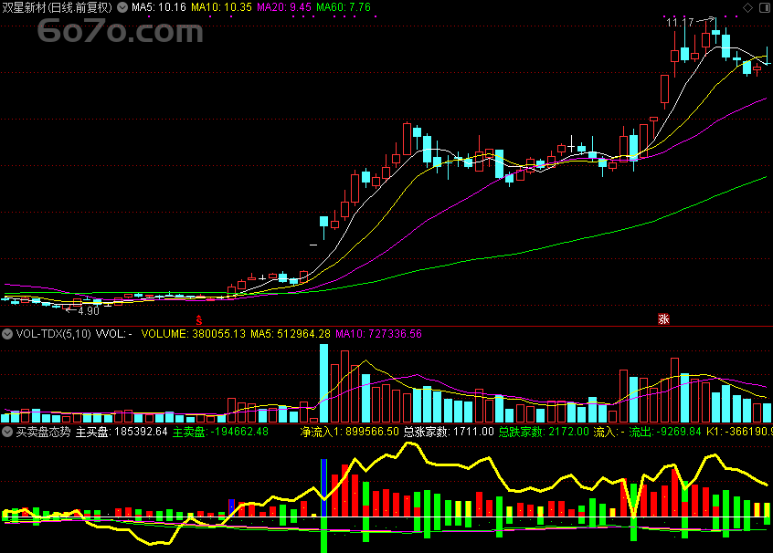 流入:IF((主买盘)-(-主卖盘)>0,(主买盘)-(-主卖盘),DRAWNULL),POINTDOT,COLORYELLOW;