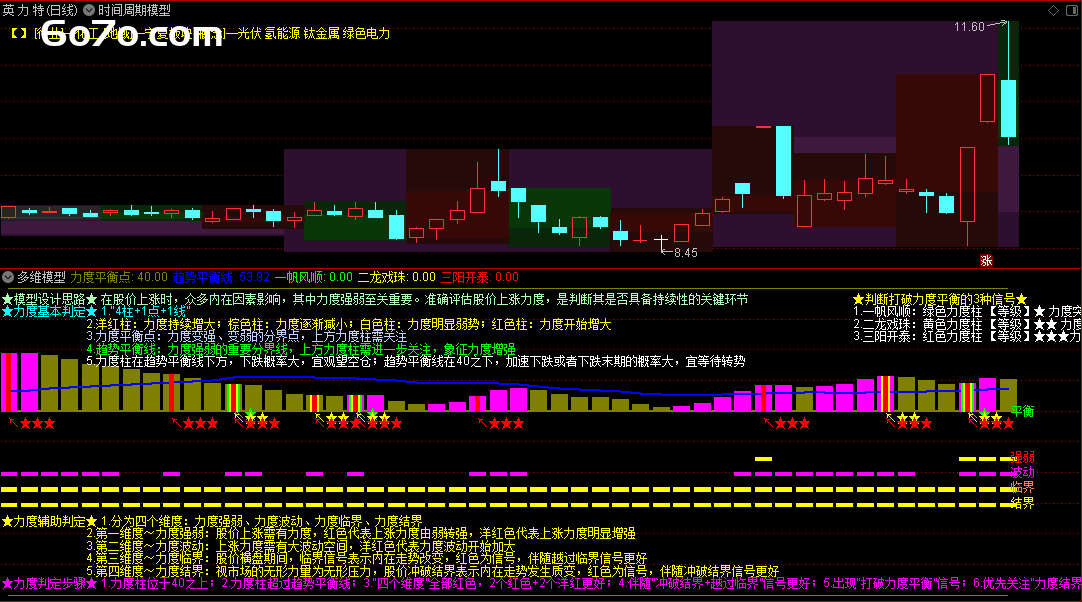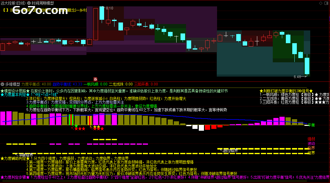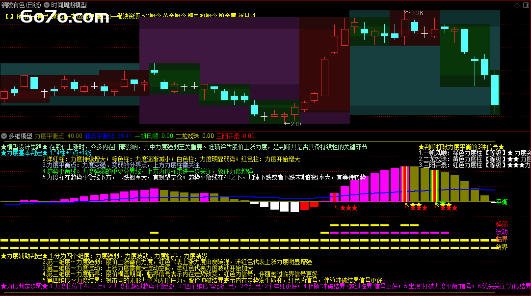 趋势平衡线:是力度强弱的重要分界线,好比高速路的匝道,上方力度柱进一步关注,象征力度增强;力度柱在其下方,下跌概率大,宜观望空仓;趋势平衡线在 40 之下,加速下跌或下跌末期的概率大,宜等待转势 。