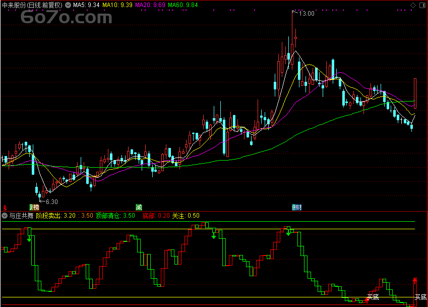 - 绿柱信号:当短期均线(MA5)向下穿越长期均线(MA20)且之前处于上行趋势时,绿柱出现,表示庄家可能在出货。