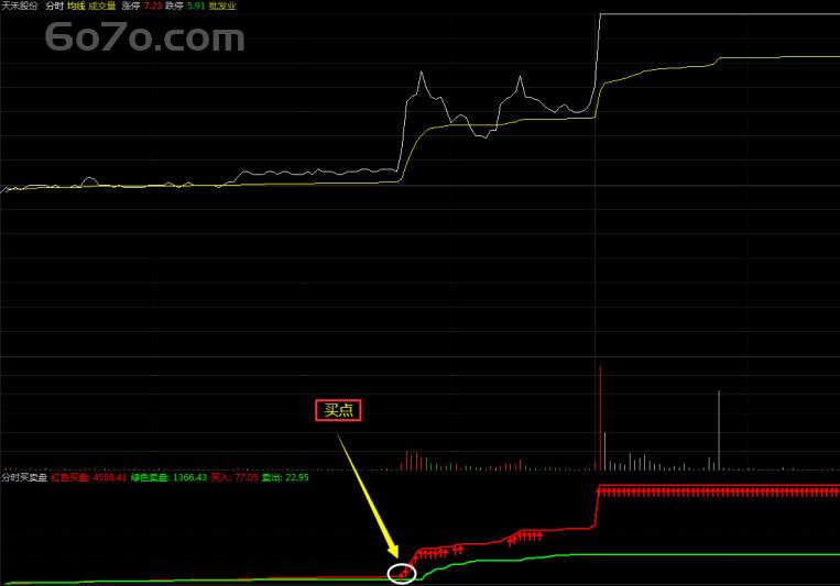 红色买盘上穿绿色卖盘:这是最佳买点,但当绿色卖盘大于红色买盘时,千万不能买!