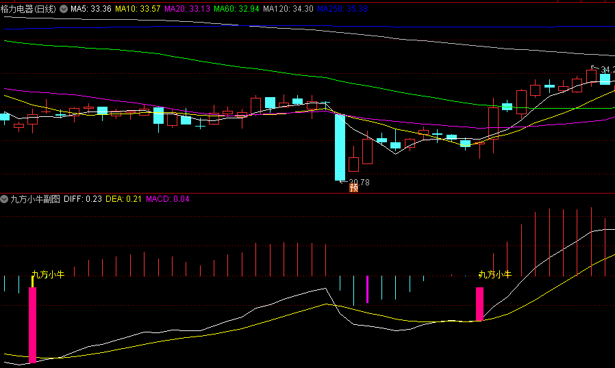 ![改良前后对比图] (模拟图示:传统MACD金叉滞后 vs 九方小牛提前捕捉启涨点)