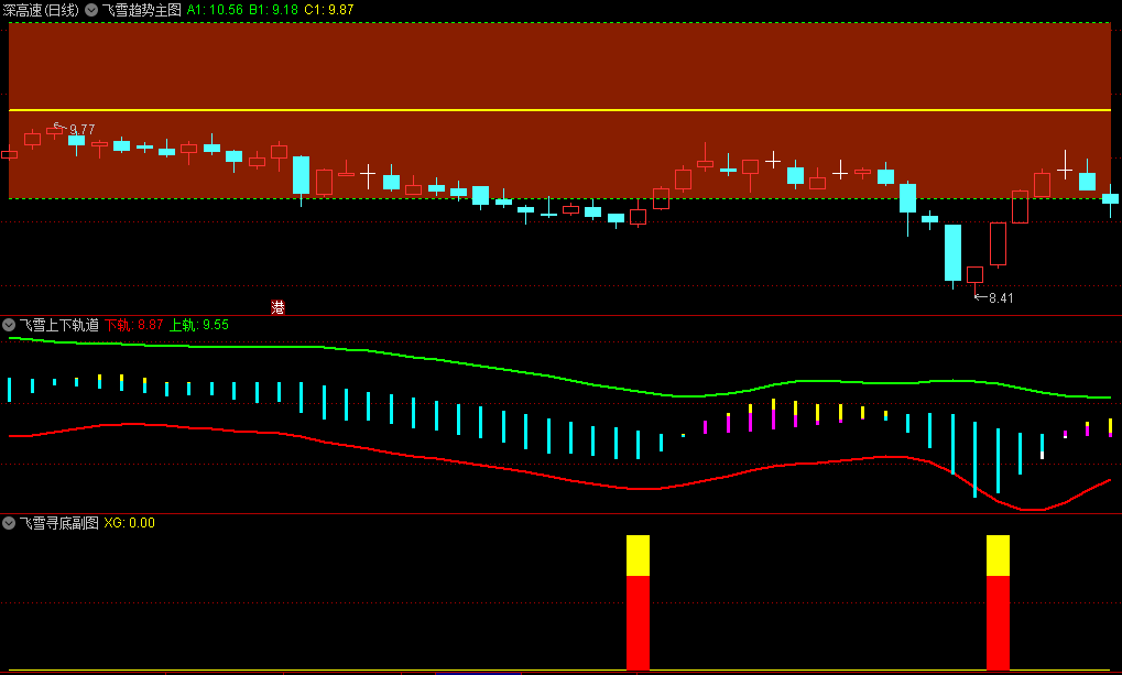 以“飞雪上下轨道”副图为例:当紫色带宽收窄至黄色带状区,说明多空博弈进入临界点。这时候,如果配合主图趋势线斜率>30度,突破概率就会骤增!(插入中国平安2023年4月突破案例图)
