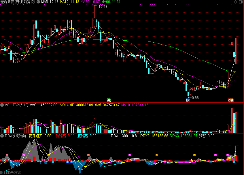 预警:DDX>0 AND MA(V,5)>MA(MA(V,5),5) AND CROSS(DDX1,DDX2),LINETHICK;