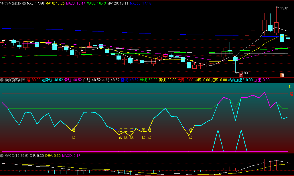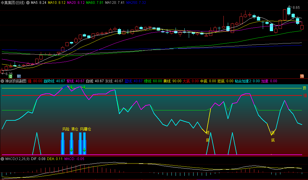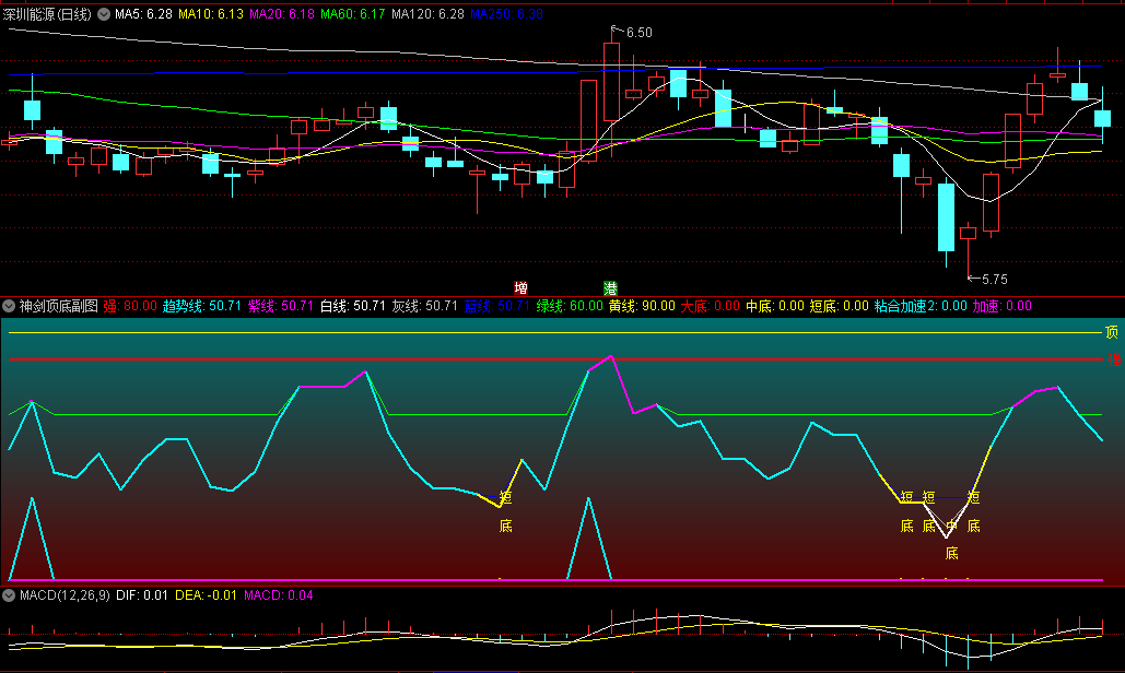 “神剑顶底”指标是我用过的最直观、最有效的工具。它用六种颜色的线,分别代表不同的市场信号: