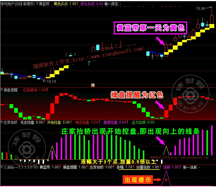 一、标准的三剑合一3个条件,卖点有两个;操盘提醒红色方块走平(动能不足卖);变蓝是最后的卖点。