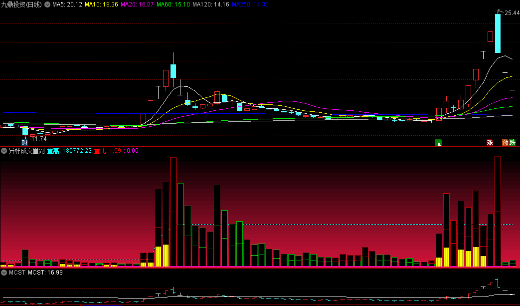 异动量柱 := IF(VOL > REF(VOL, 10) * 3 AND VOL > MA(VOL, 20) * 2, 50, 0), STICK;