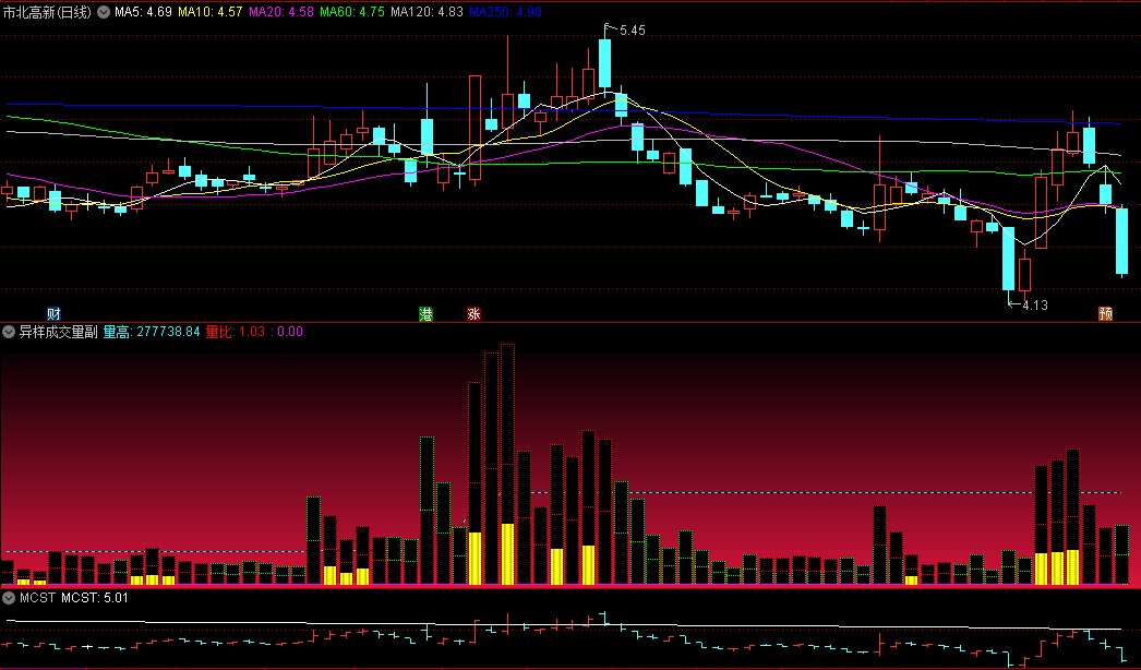 量能异动 := VOL / REF(VOL, 1) > 2.5 AND C / REF(C, 1) > 1.06;