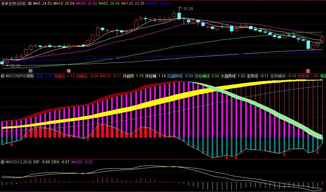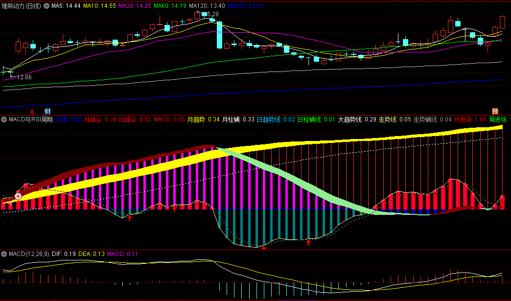 红立柱=主力边打边撤(MACD死叉+RSI顶背离)