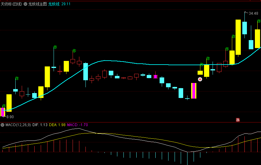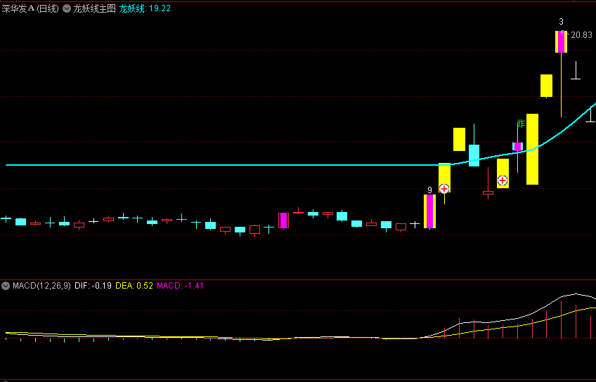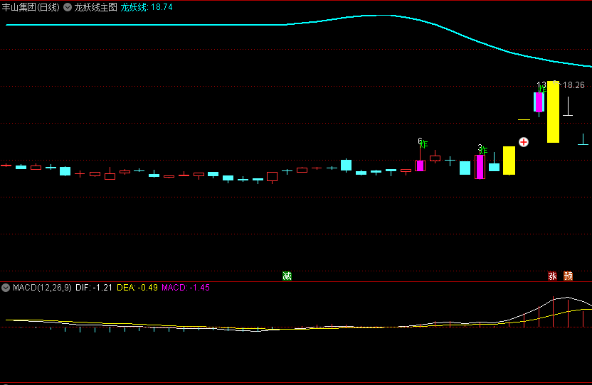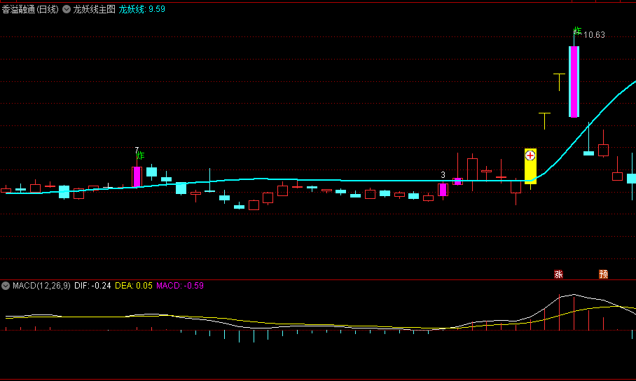 // 龙妖线主图指标// 无未来函数,不漂移VAR1:=EMA(CLOSE,2);VAR2:=EMA(VAR1,2);VAR3:=EMA(VAR2,3);主力: VAR3, COLORRED, LINETHICK1;散户: EMA(EMA(EMA(EMA(EMA(CLOSE,2),2),2),2),7), COLORBLUE, LINETHICK1;// 洗盘信号五日位置:=WMA(((2*CLOSE+HIGH+LOW)/4-LLV(LOW,5))/(HHV(HIGH,5)-LLV(LOW,5))*100,2);五日加权:=WMA(0.618*REF(五日位置,1)+0.382*五日位置,2);DRAWTEXT(CROSS(五日加权,五日位置) AND 五日位置>70 AND 主力>散户 AND ((HIGH-OPEN)< (OPEN-CLOSE) AND CLOSE< OPEN) AND REF(CLOSE,1)< REF(CLOSE,2)*1.095,HIGH+0.07,'←洗盘'), COLORGREEN;// 打首板信号长庄强度:=(EMA(CLOSE,14)-REF(EMA(CLOSE,14),1))/REF(EMA(CLOSE,14),1)*100, NODRAW;DRAWTEXT(CROSS(长庄强度,0) AND CLOSE>=REF(HHV(HIGH,7),1) AND CLOSE>REF(CLOSE,1)*1.097 AND CLOSE=HIGH AND CROSS(主力,散户) AND CLOSE>=主力 AND CLOSE>OPEN,LOW*0.98,'←打首板'), COLORYELLOW;// 清仓信号DRAWTEXT(((REF(CLOSE,1)>REF(CLOSE,2)*1.096 AND REF(CLOSE,2)>REF(CLOSE,3)*1.096 ) AND CLOSE< REF(CLOSE,1)*1.095),HIGH,'←清仓'), COLORYELLOW;// 涨停板信号涨停板:=(CLOSE>=ZTPRICE(REF(CLOSE,1),IF(FINANCE(3)=4,0.2,0.1)));一板:=涨停板 AND NOT(REF(涨停板,1)) AND HIGH=CLOSE AND FINANCE(42)>20;二连板:=STICKLINE(EVERY(涨停板,2) AND NOT(REF(涨停板,2)) AND FINANCE(42)>30 AND VOLUME< REF(VOLUME,1),(OPEN+CLOSE)/2,CLOSE,1,0), COLORRED;三连板:=EVERY(涨停板,3) AND NOT(REF(涨停板,3)) AND FINANCE(42)>20 AND VOLUME< REF(VOLUME,1);// 信号标注DRAWTEXT(一板 AND CLOSE>OPEN AND VOLUME>REF(MA(VOLUME,5),1)*2,LOW*0.9,'↑试仓'), COLORRED;DRAWTEXT(二连板 ,LOW-0.07,'二进三'), COLORYELLOW;DRAWTEXT(三连板 ,OPEN,'龙妖'), COLORYELLOW;