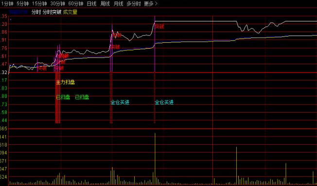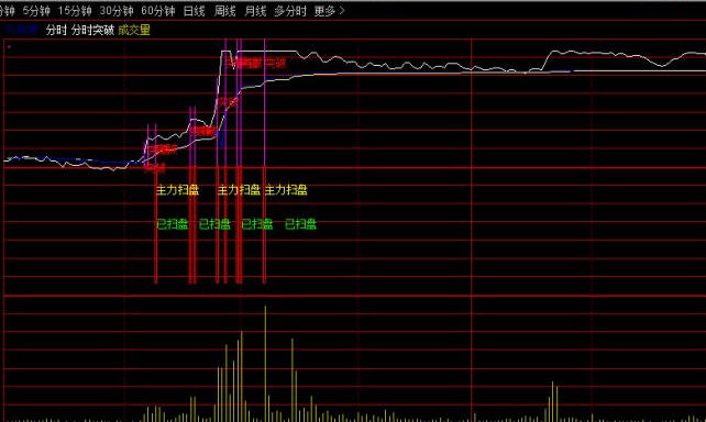 { 主力扫盘分时突破 —— Deepseek自动生成 }现价:=C,COLORWHITE,LINETHICK2;均价11:=SUM(C*V,240)/SUM(V,240),COLORYELLOW,LINETHICK2;TT:=BARSCOUNT(C);前高:=REF(HHV(H,TT),1);突破:=CROSS(C,REF(HHV(H,TT),1)) AND C/均价11<1.09 AND TT>1 AND TT<240;主力扫盘:=COUNT(突破,13)>=3 AND CROSS(C,REF(HHV(H,TT),1));已主力扫盘:=BARSLAST(主力扫盘)<13;SG_2:=DYNAINFO(4)>0 AND HHV(HIGH,2)/LLV(LOW,2)<1.25 AND REF(CLOSE,1)<LLV(LOW,3)+(HHV(HIGH,3)-LLV(LOW,3))*0.85;SG_9:=EMA(CLOSE,2);SG_10:=EMA(CLOSE,3);SG_11:=MAX(SG_9,SG_10);X2:=CLOSE>SG_11 AND SG_2 AND (CLOSE>REF(HHV(HIGH,2),1) AND (CLOSE-REF(CLOSE,1))/REF(CLOSE,1)>0.015) AND (V/CAPITAL<=0.2) AND C/REF(C,1)<1.07;NX:=MA(((SLOPE(C,20)*5)+C),10);B1:=HOUR=09 AND MINUTE=45;B20:=LLV(L,15);gzb0:=BARSLAST(B1);B4:=REF(B20,gzb0);B5:=CONST(B4),COLORFF80FF,CIRCLEDOT,LINETHICK2;C1:=HOUR=09 AND MINUTE=45;C2:=HHV(H,15);C3:=BARSLAST(C1);C4:=REF(C2,C3);DRAWICON(FILTER(CROSS(zbpc1,zbpc2),240),OPEN*1,5);DRAWTEXT(FILTER(CROSS(zbpc1,zbpc2),240),OPEN*0.985,'抓'),COLORFF0000;TT1:=BARSCOUNT(C);均价黄:=SUM(C*V,TT1)/SUM(V,TT1);量两步:=MA(V,5)>REF(MA(V,5),1) AND REF(MA(V,5),1)>REF(MA(V,5),2);价两步:=C>=REF(C,1) AND REF(C,1)>REF(C,2);价上岗量破5:=C>均价黄 AND V>MA(V,5);量起爆:=V>=REF(V,1)*1;价创新高:=C>=HHV(C,0);量创新高:=V>=HHV(V,0);对昨日涨幅:=(C/DYNAINFO(3)-1)*100<=4.50;每日一点:=量两步 AND 价两步 AND 价上岗量破5 AND 量起爆 AND 价创新高 AND 量创新高 AND 对昨日涨幅;VV:=BARSSINCE(每日一点)+1;首次起爆价:=REF(C,VV-1),NODRAW;起爆涨幅:=(DYNAINFO(7)-首次起爆价)/首次起爆价*100,NODRAW;流通盘:=CAPITAL*100/100000000,NODRAW;起爆时间:=REF(TIME/10000,VV),NODRAW;已爆分钟:=VV-1,NODRAW;DRAWICON(每日一点,C,25);DRAWTEXT(每日一点,L-0.01,'←分时起爆'),COLORYELLOW;DRAWNUMBER_FIX(ISLASTBAR AND C>1,0.8,0.5,0,起爆涨幅),COLORFF0000;DRAWTEXT_FIX(ISLASTBAR AND C>1,0.8,0.45,0,'起爆涨幅'),COLOR0000FF;DRAWTEXT_FIX(ISLASTBAR AND C>1,0.85,0.5,0,'%'),COLOR0000FF;ACX:=FILTER(CROSS(zbpc1,zbpc2),240);ACX1:=BARSSINCE(ACX)+1;第一次打板价格:=REF(C,ACX1-1),NODRAW;打板涨幅:=(DYNAINFO(7)-第一次打板价格)/第一次打板价格*100,NODRAW;DRAWNUMBER_FIX(ISLASTBAR AND C>1,0.8,0.35,0,打板涨幅),COLORFF0000;DRAWTEXT_FIX(ISLASTBAR AND C>1,0.8,0.3,0,'打板涨幅'),COLOR0000FF;DRAWTEXT_FIX(ISLASTBAR AND C>1,0.85,0.35,0,'%'),COLOR0000FF;全部买入:=CROSS(C,REF(HHV(H,TT),1)) AND HHVBARS(VOL,TT)=0 AND C/均价11<1.09 AND TT>1 AND TT<240 AND BARSLAST(主力扫盘)>=20 AND 对昨日涨幅;DRAWTEXT(全部买入,前高,'←全仓'),COLORCYAN;DRAWICON(全部买入,C,23);对昨日涨幅1:=(C/DYNAINFO(3)-1)*100<=7;价2步:=C/REF(C,3)>1.04;DRAWTEXT(价2步,C*0.995,'←突'),COLORYELLOW;现:=100*(C-REF(C,1))/REF(C,1);量:=SUM(V,FROMOPEN);买入:=SUM(IF(现>=0 AND V>CAPITAL*0.0005 AND PERIOD=0,V,0),FROMOPEN);卖出:=SUM(IF(现<0 AND V>CAPITAL*0.0005 AND PERIOD=0,V,0),FROMOPEN);小仓买入:=SUM(IF(现>=0 AND V<CAPITAL*0.0005 AND PERIOD=0,V,0),FROMOPEN);小仓卖出:=SUM(IF(现<0 AND V<CAPITAL*0.0005 AND PERIOD=0,V,0),FROMOPEN);gzb1:=100*买入/量;gzb2:=100*卖出/量;gzb3:=100*小仓买入/量;gzb4:=100*小仓卖出/量;DRAWRECTREL(133,CONST(100-gzb1)*1000/100,159,1000,RGB(255,0,0));