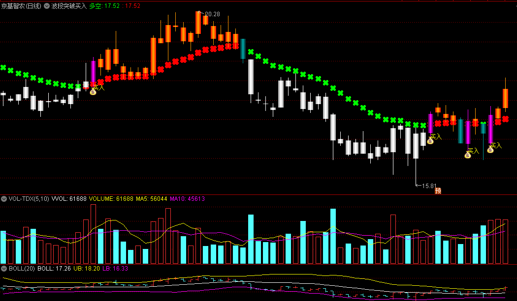 假设你设置的N值为10,也就是看10天的最高价。当股价在第11天收盘价超过了这10天的最高价时,就会在主图上出现一个买入信号。就像下面这样: